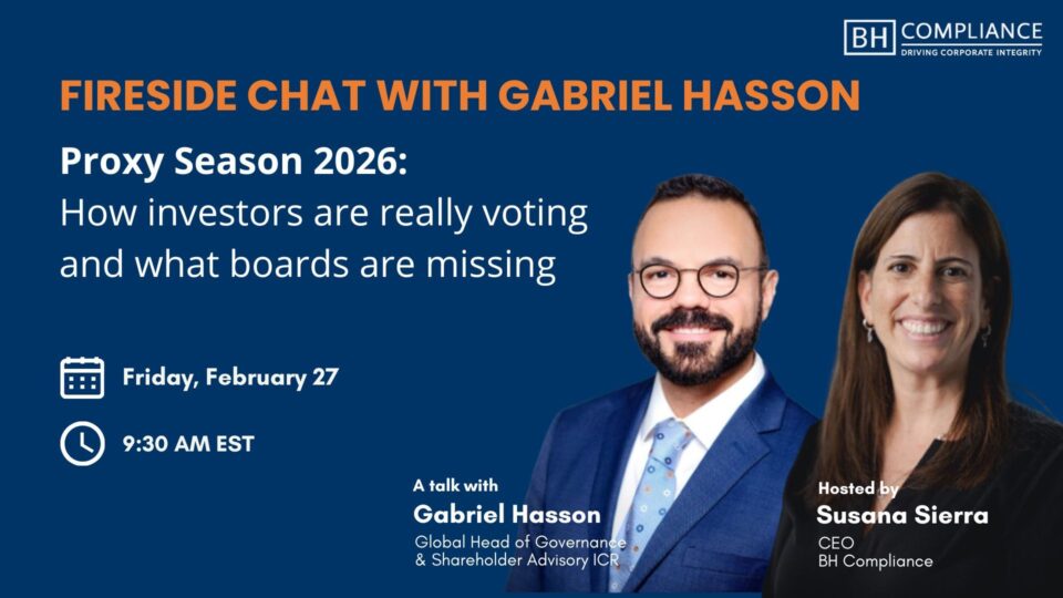 Last Friday, February 27, BH Compliance hosted its first Fireside Chat — a strategic conversation designed to analyze Proxy Season 2026 and better understand how investors are really voting and what boards may be overlooking.
